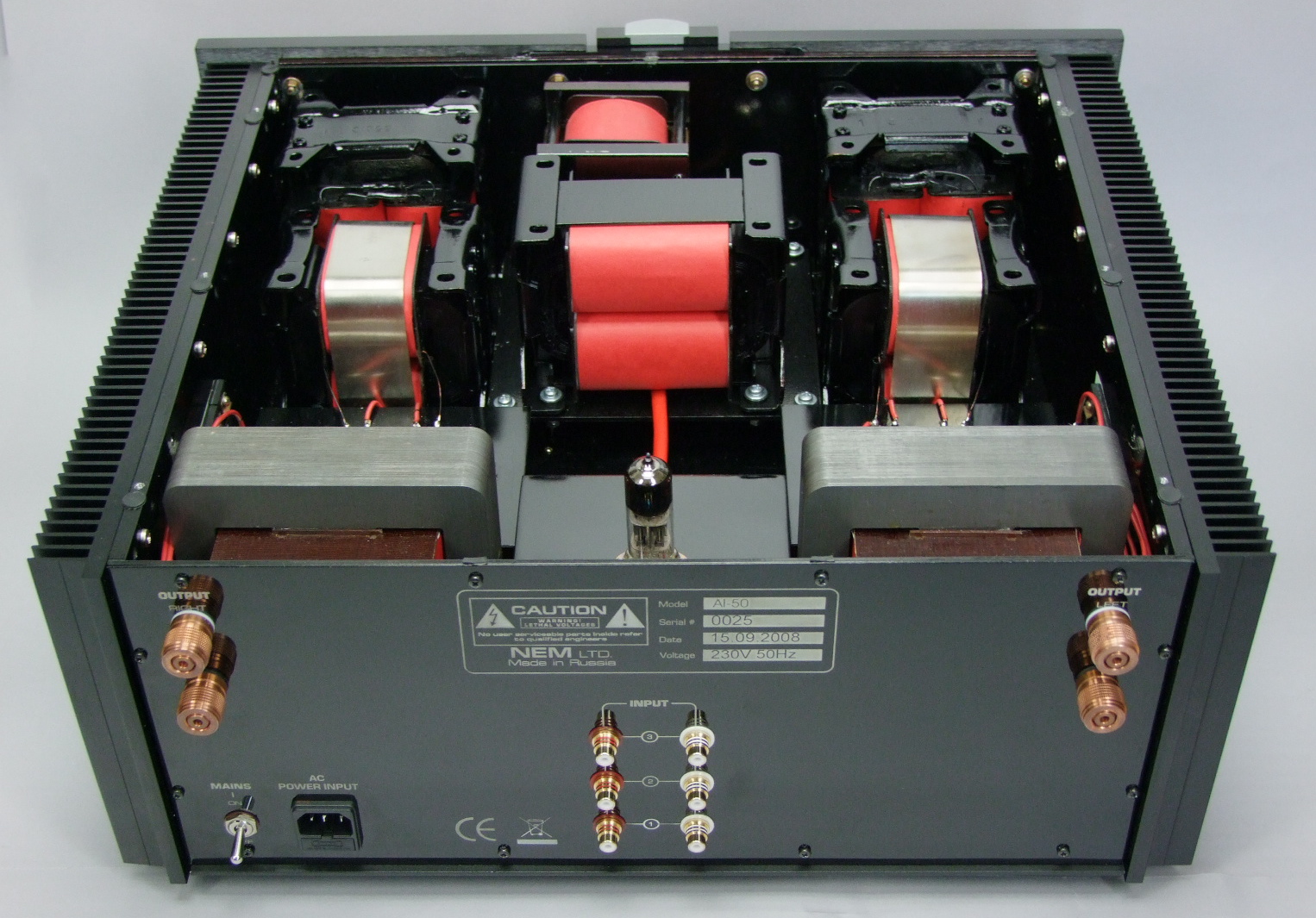 Im NEM AI-50 ist die Treiberröhre ausschließlich für die Spannungsverstärkung des Musiksignals zuständig, während vier Leistungstransistoren pro Kanal ausschließlich die Stromverstärkung übernehmen. Der Zwischenübertrager ist präzise auf das Zusammenspiel von Treiberröhre und Transistorendstufe abgestimmt. Auch dieser Übertrager wird von NEM selbst gefertigt. Er besitzt einen Wirkungsgrad von 99,5 % und bietet selbst unter Volllast einen linearen Frequenzgang von 4 bis 80.000 Hertz (-3dB). Ein besonderer technischer Leckerbissen sind die aufwendige Netzteile, auf die NEM besonders stolz ist. Eine speziell entwickelte Schaltung aus Gleichrichtern, Drosseln und Kondensatoren sorgt für einen nahezu unerschöpflichen, besonders glatten und von Oberwellen freien Strom für reinen Klanggenuss. Die Schaltung unterdrückt Oberwellen der Diodenkennlinie und garantiert einen ruhigen Stromfluss. Nicht zuletzt durch das Netzteil besticht der NEM IA-50 mit einer knackigen, unerschütterlichen Basswiedergabe, mit brillanten Mitteltonlagen und seidigen Höhen, auch die blitzschnelle Impulswiedergabe des Verstärkers darf als herausragend gelten. Der zugleich audiophile und überaus mächtige Hybrid-Verstärker treibt praktisch jeden Schallwandler zur klanglichen Höchstleistung – ein Traumgerät für jeden ernsthaften Musikliebhaber.